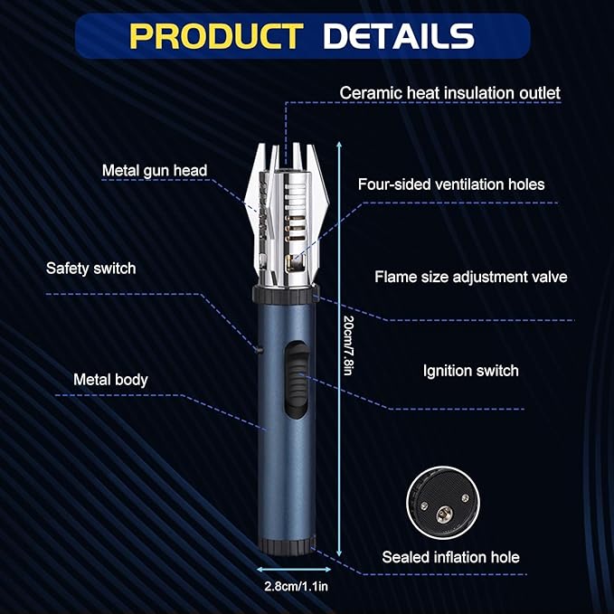 - 【Portable and Durable】 This butane torch lighter is small and portable, easy to use, can be cyclically inflated and recycled, and has a wide range of scenes, for outdoor bbq, camping, kitchen cooking, etc.